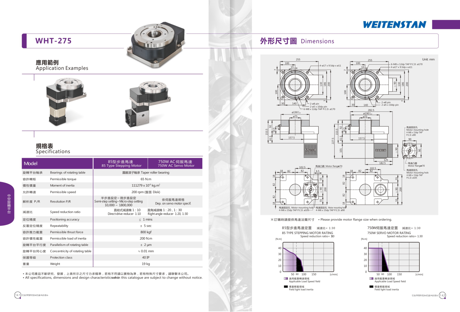 WHT系列中空旋轉(zhuǎn)平臺(tái)。 具有優(yōu)異定位精度與重復(fù)精度的中空旋轉(zhuǎn)平臺(tái),可搭配使用伺服馬達(dá)或步進(jìn)馬達(dá),展現(xiàn)獨(dú)特的性能可靠度。 工作物可直接鎖固。旋轉(zhuǎn)盤面可直接鎖固工作物,提升工件裝載之方便性。 配線方便。此旋轉(zhuǎn)平臺(tái)為中空式設(shè)計(jì),無論是配線或配管均方便。 高精度。定位精度小于1分。重復(fù)精度可達(dá)±5秒。 運(yùn)轉(zhuǎn)動(dòng)作平穩(wěn)。盤面轉(zhuǎn)動(dòng)平穩(wěn),順暢,且定位快速。 適用各種馬達(dá)。中空旋轉(zhuǎn)平臺(tái)可采用各種廠牌之伺服馬達(dá)或步進(jìn)馬達(dá)驅(qū)動(dòng)。